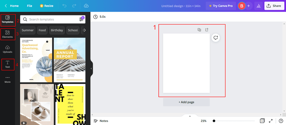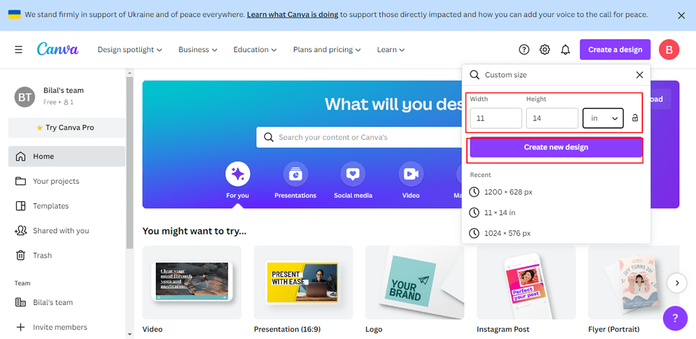 Select a custom size, put the canvas dimension at 11 inches width and 14 inches height, and click on create a new design.
